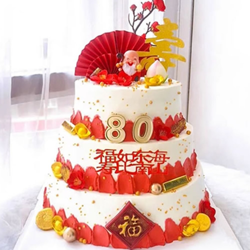 [材 料]:三层鲜奶祝寿蛋糕(6+10+14英寸),寿星、福字装饰