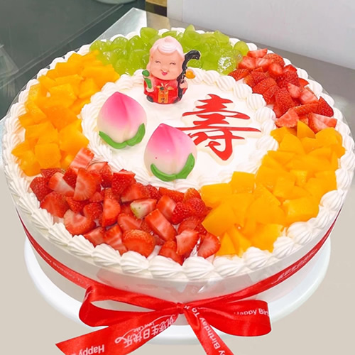 [材 料]:8寸圆形鲜奶水果蛋糕,2个寿桃1个寿星装饰,大红色的寿字,时令水果外围