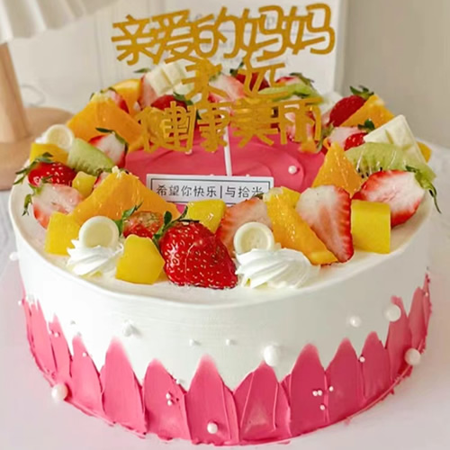 材 料: 8寸圆形鲜奶水果蛋糕,亲爱的妈妈,永远健康美丽字牌装饰