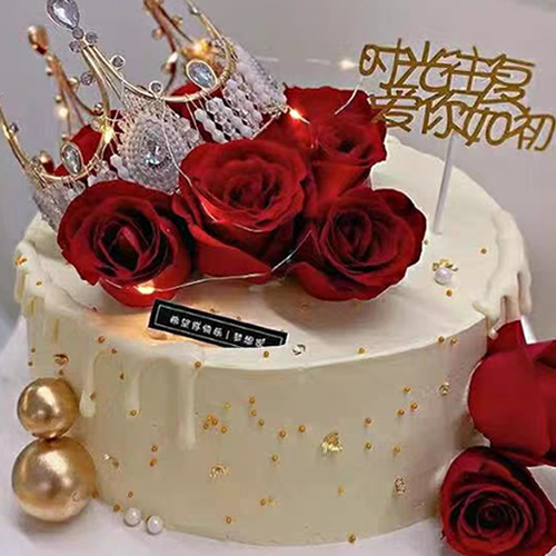8寸圆形鲜奶蛋糕,玫瑰花、灯串、皇冠、爱你如初字牌装饰