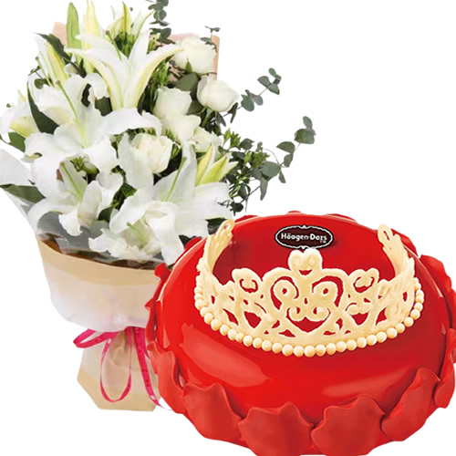 材 料: 12朵白百合,6枝白玫瑰,尤加利若干,白相思梅若干;蛋糕:哈根达斯冰淇淋蛋糕 玫瑰女王700g
