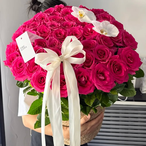 [材 料]:52枝弗洛伊德玫瑰,2朵白色蝴蝶兰,丝带花结装饰,栀子叶